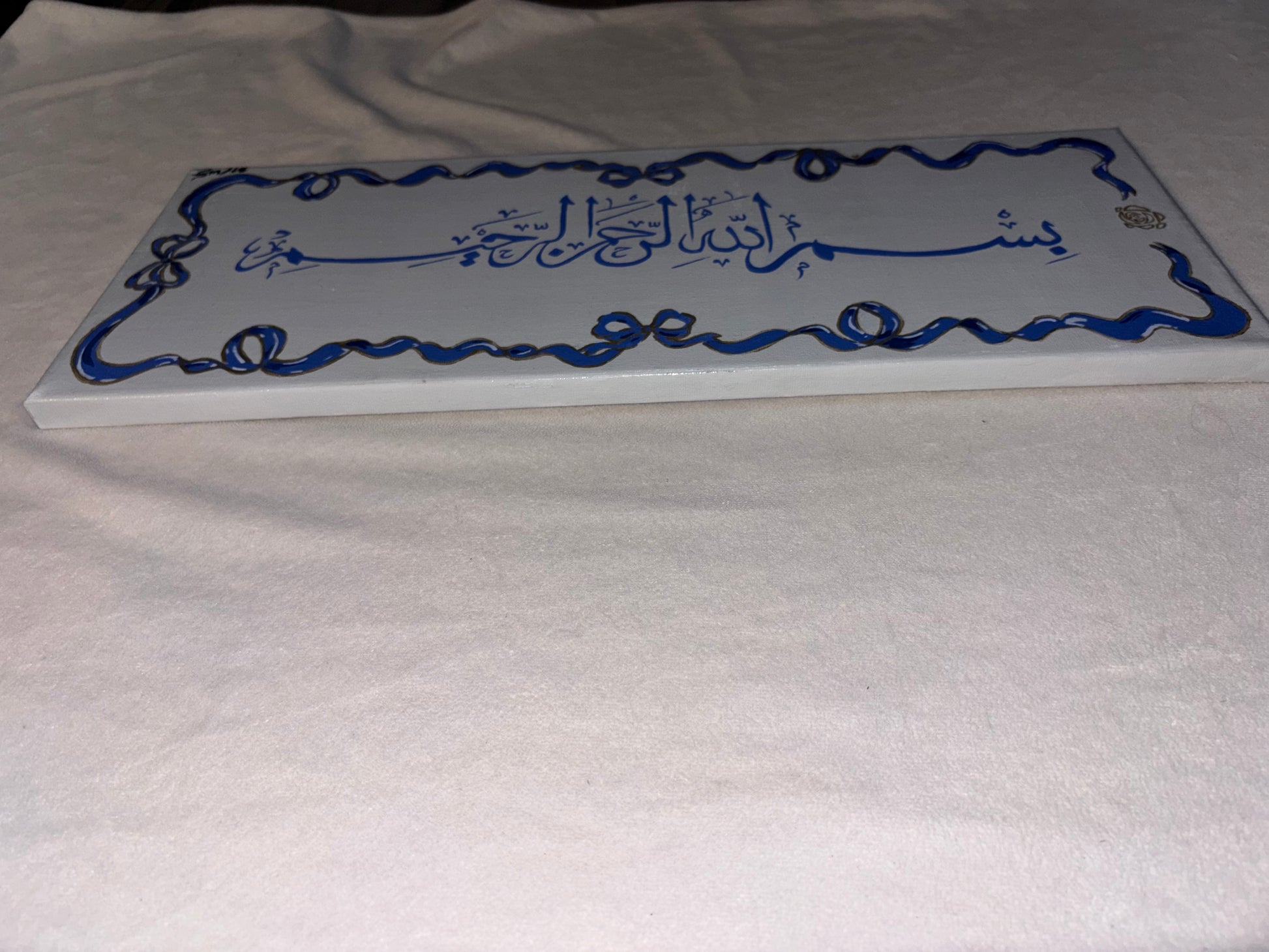 A graceful hand-painted artwork featuring the sacred phrase “بسم الله الرحمن الرحيم” (In the name of Allah, the Most Merciful, the Most Compassionate). Designed with a soft pastel light blue & dark blue palette and adorned with an elegant bow-inspired border, this piece combines delicate femininity with spiritual depth.