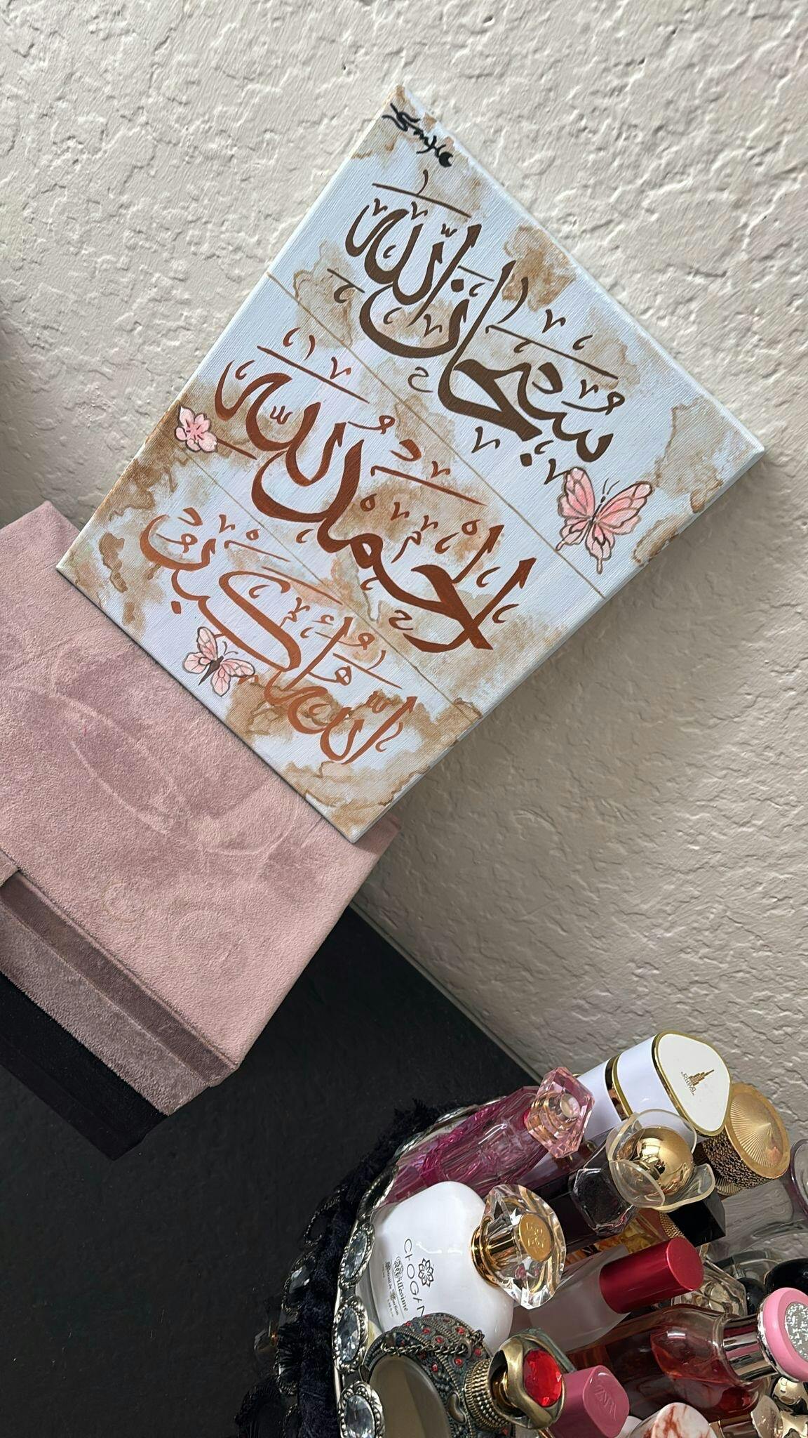 A serene and elegant hand-painted artwork featuring the sacred dhikr: “Subhan’Allah, Alhamdulillah, Allahu Akbar” — Glory be to Allah, all praise is due to Allah, and Allah is the Greatest. This piece beautifully blends soft earth tones with delicate pink butterflies, symbolizing peace, renewal, and divine grace.