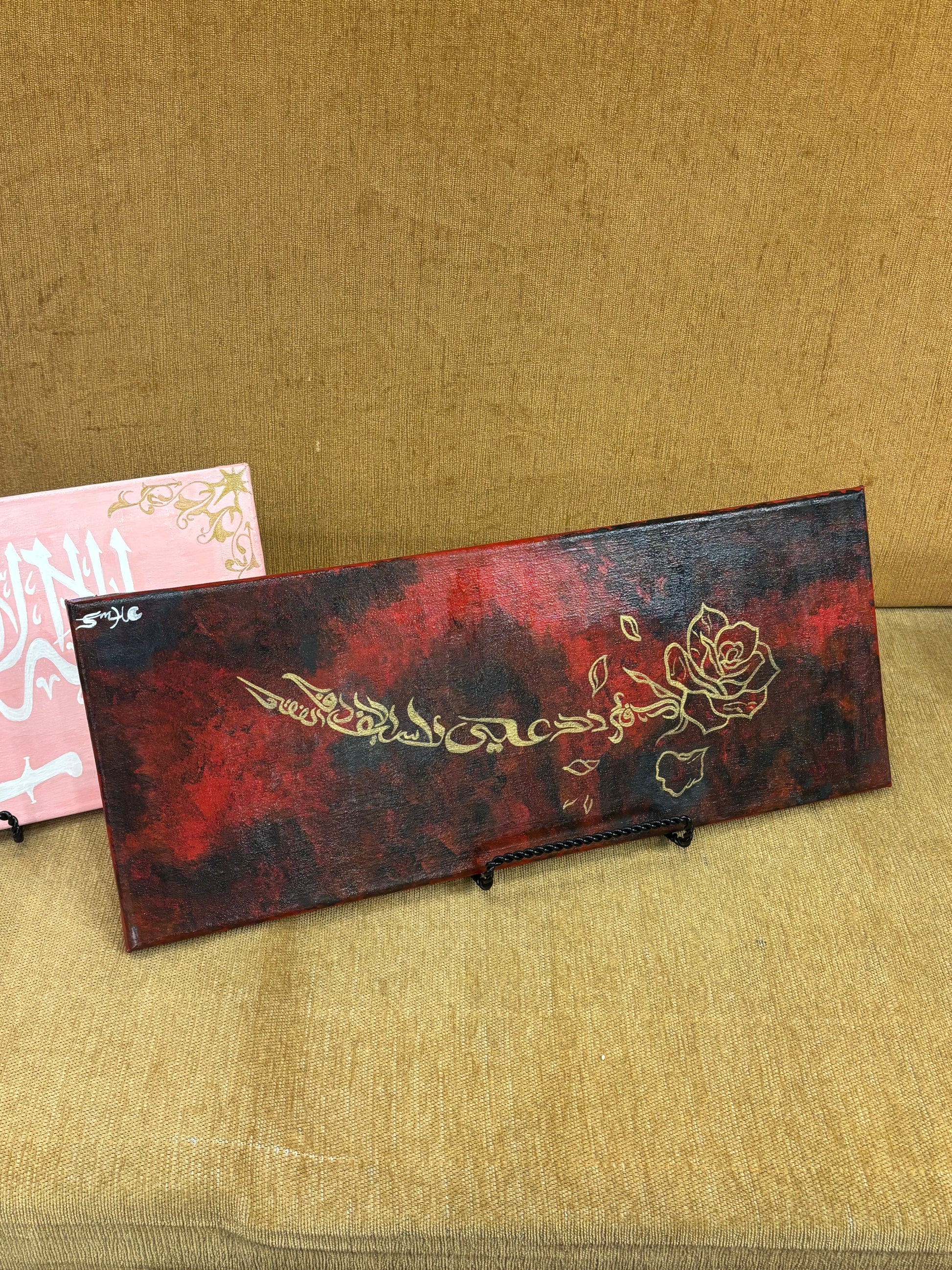 The artwork features flowing golden Arabic calligraphy intertwined with a delicate rose motif, set against a rich red and black textured background that evokes both power and passion. The deep tones and gold accents create a striking balance between strength and beauty.